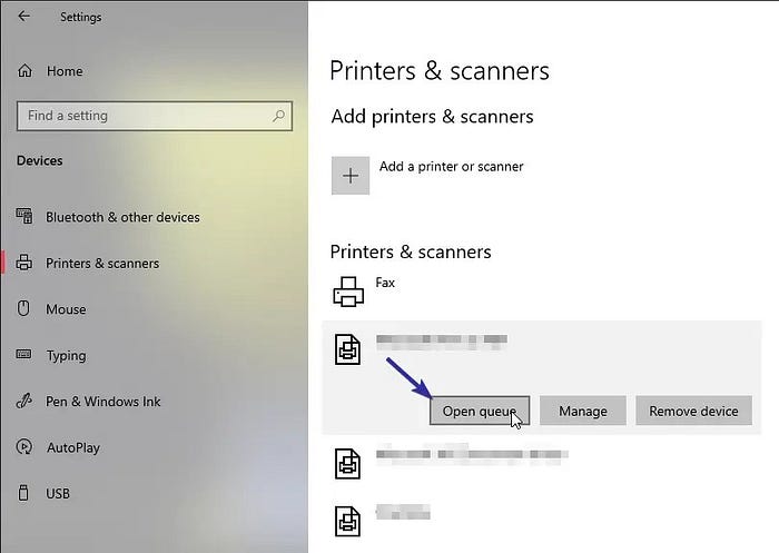 - After that, select your printer’s name and click the Open queue button.